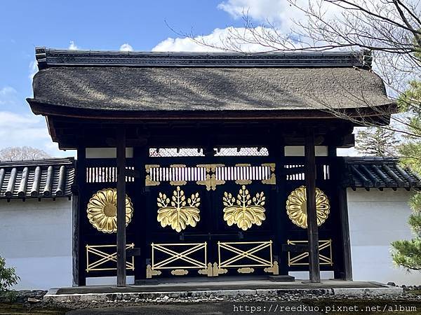 被指定為國寶的唐門是進入三寶院的大門,專供朝廷使者使用,整扇門塗黑漆並飾有4枚貼金箔的蒔繪,皇室專用的16瓣菊花紋和豐臣秀吉家紋桐花紋各2枚。