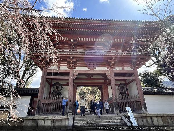 由三寶院走一段參道經過仁王門進入下醍醐,仁王門前的參道旁枝垂櫻也開了約3、4分,也引來遊客競相拍攝。下醍醐是金堂所在,另有不動堂、清瀧宮、五重塔及鐘樓等等建築群,佔地寬廣,下醍醐各個建築物四週也種了不少枝垂櫻,也都開了約3、4分左右,整個建物搭配櫻花、藍天,即便櫻花只開了3、4分已是十分動人,難怪醍醐寺能讓豐臣秀吉選為花會的地點,而有了史上最著名的「醍醐花見」。