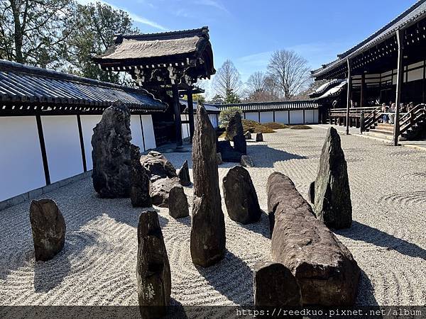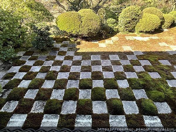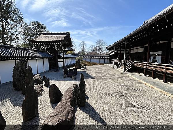 東福寺除了通天橋賞楓外,方丈庭園亦很有可看性,方丈庭園內有東、西、南、北庭總共有4個不同造形的庭園造景,東庭顯現的意境是北斗七星,南庭的意境是4個神仙島、京都五山和須彌山,西庭是大市松,北庭是苔和板石形成小市松。
