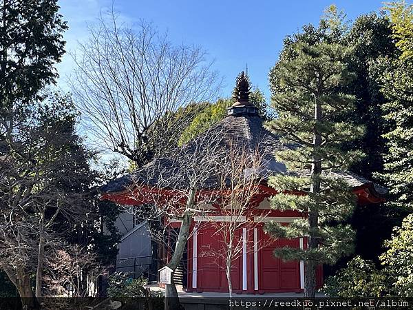 愛染堂是一座紅色的八角圓堂建築,裏面供奉愛染明王; 在愛染堂一旁的門是月下門,月下門外是臥雲橋。